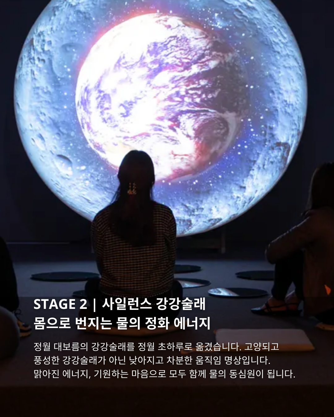 두 번째 스테이지는 침묵의 강강술래입니다. 무용가 강민정의 가이드로 자리를 일어나 천천히 원을 그리며 걷습니다. 맑아진 숨소리에 맞춰 발걸음을 옮기는 이 시간은, 고양되는 춤이 아닌 '움직이는 기도'입니다.