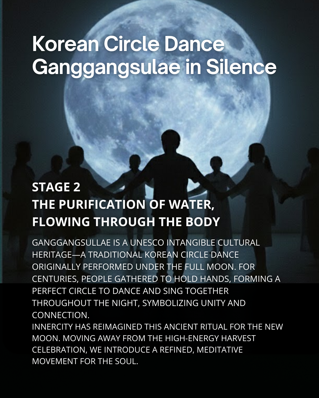 반복되는 느린 걸음 속에 타인과의 경계는 흐릿해지고, 생각은 텅 비워집니다. 마치 돌탑을 돌듯 경건하게, 움직임 자체로 정화가 일어나는 무브먼트 리추얼입니다.