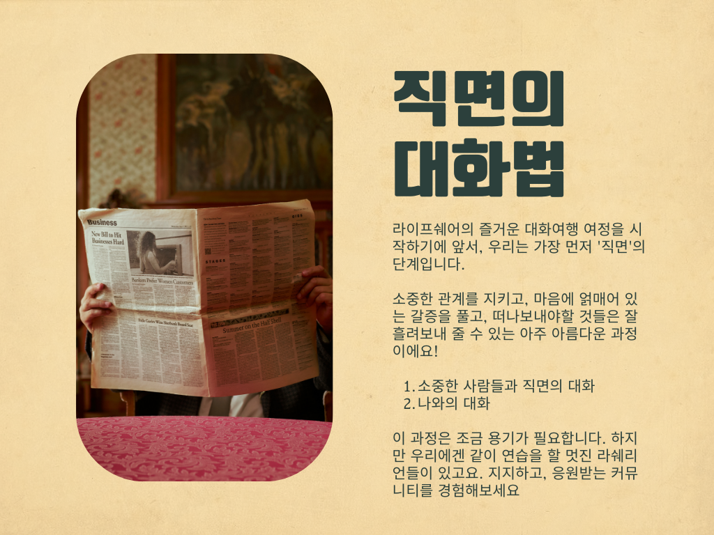 대화는 잘만 활용하면 평생 이어지는 학습으로, 대화 속에서 내안에 잃어버렸던 소중한 것을 되찾을 수 있습니다. 라이프쉐어 대화를 나눌 수록 우리는 내면은 성장합니다.