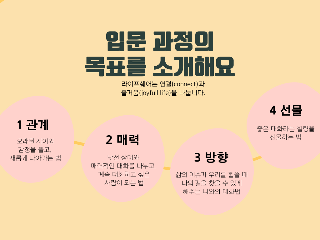 - 혜택 : 1) 온/오프라인 라이프쉐어 연습모임 3개월 무료 초대 (월 2회~3회)